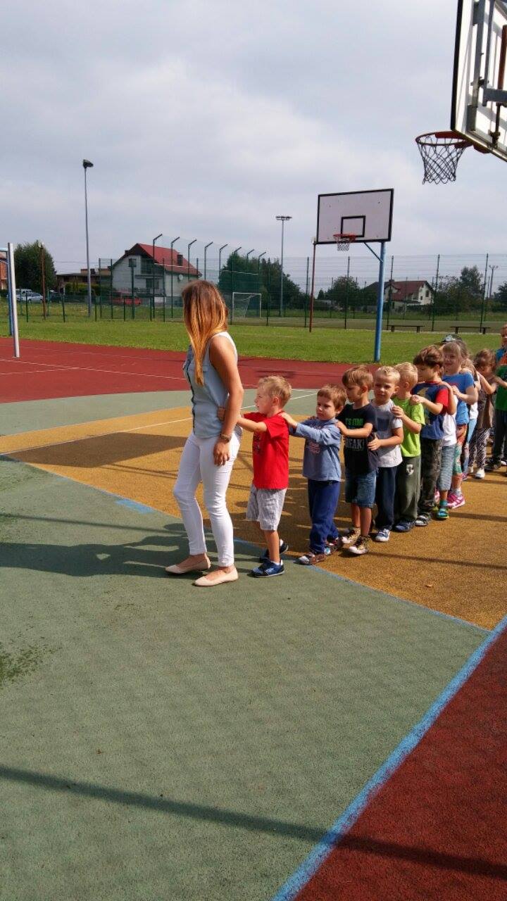 Dziś wyjście na podwórko miało inny charakter, ponieważ poszliśmy na spacer w okolicy przedszkola. Po spacerze poszliśmy na boisko i wraz z zerówką tańczyliśmy i śpiewaliśmy "Labada". Po zabawie wróciliśmy do przedszkola. I to nie w parach! Stworzyliśmy baaaaaaardzo długiego węża i pełzając po placu szkolnym dotarliśmy do drzwi naszego przedszkola :-)