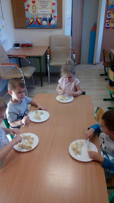 Dzisiaj w przedszkolu dzień pełen wrażeń. Najpierw były zajęcia badawcze - sprawdzaliśmy jak na nasze zęby działa niezdrowe jedzenie oraz kwasy na podstawie jajka zamoczonego na noc w occie. Okazało się, że jego skorupka stała się miękka. Z tego morał - jemy zdrowo.