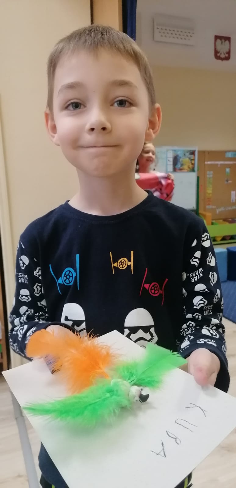 i kolorowych piórek ćwicząc motorykę małą i wyobraźnię.